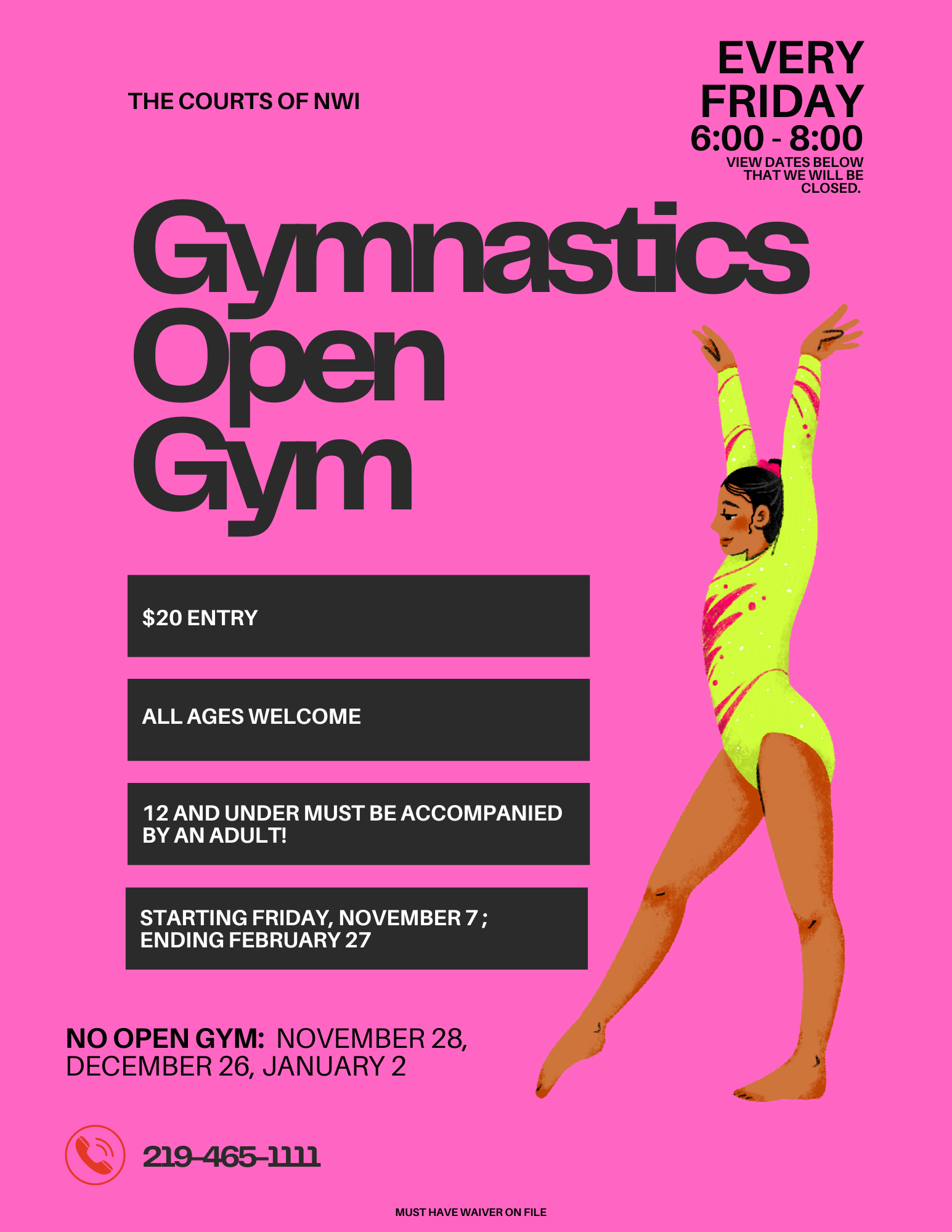 No Open Gym; Nov 28th, Dec 26th and Jan 2nd